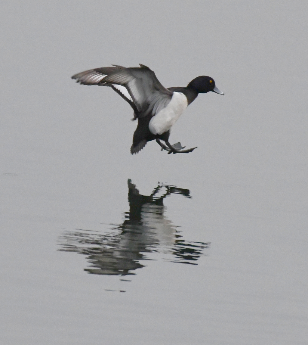 Darke Tufted duck landing on the Main lake