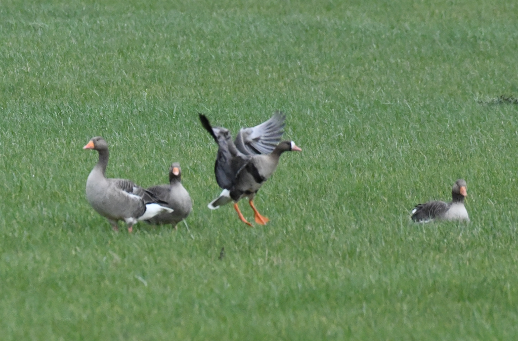 The family of 3 White-fronted geese were in the North field opposite the Far lake amongst the Greylags, with a skein of 120 Pink-footed geese seen flying north,